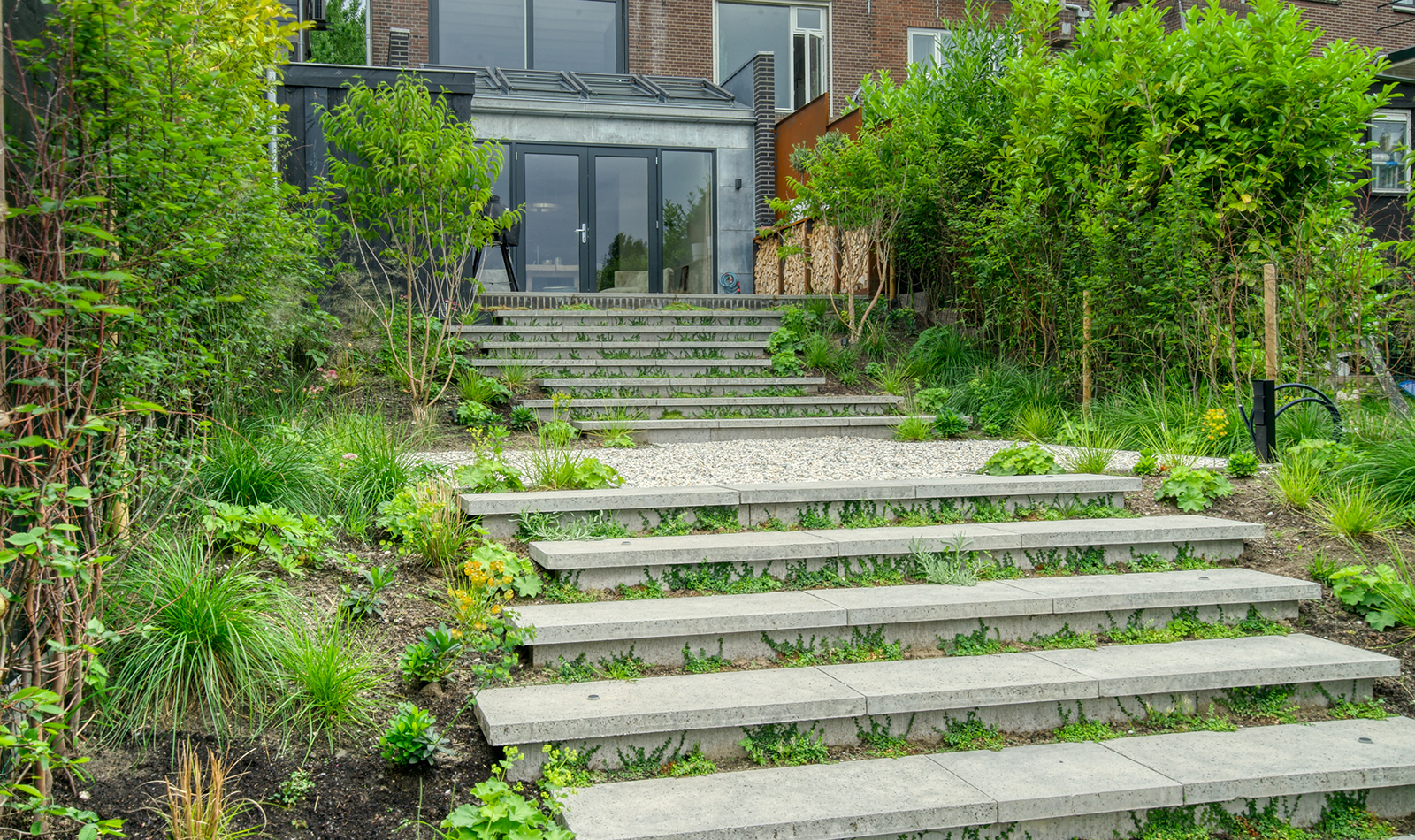 Het ontwerp maakt optimaal gebruik van de beschikbare ruimte, met strategisch geplaatste beplanting en open terrassen die zorgen voor een ruimtelijk effect. Het gebruik van hoogwaardige planten en natuurlijke elementen zorgt voor een harmonieus geheel, waar rust en luxe samenkomen in een groene oase.
